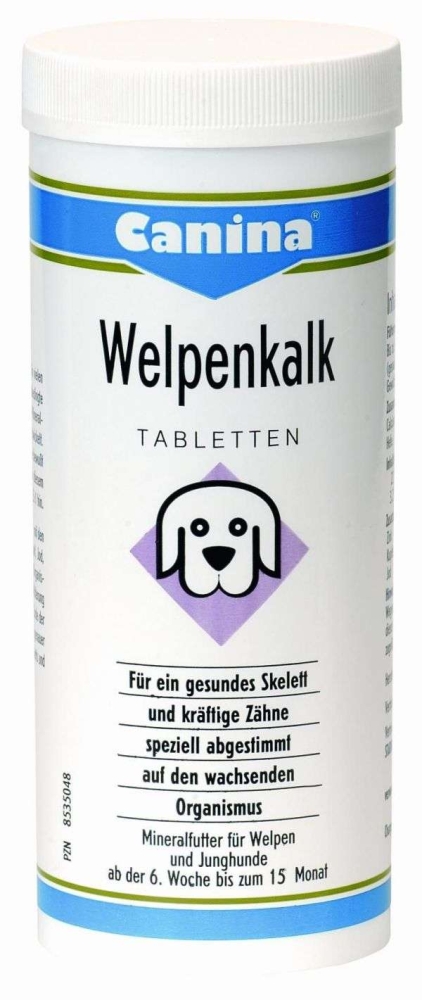 Welpenkalk Tabletten: Mineralfutter für Welpen und Junghunde. Abgestimmt auf den wachsenden Organismus - Sorgt für gesunde Zähne und einen kräftigen Knochenbau - Günstiges Calcium-Phosphor-Verhältnis von 3:1 - Zufütterung ab ca. 6. Woche über die gesamte Wachstumsphase bis ca. 15 Monate. Aufgrund der heutigen Futterzusammensetzung sind in vielen Fällen die Welpen frohwüchsig. Bedingt durch die Unterversorgung an Calcium und Mineralstoffen sind oftmals die Zähne sowie das Skelett unterentwickelt, und es entstehen Zahn-HD-Probleme sowie Knochenerweichung. Bei Caninas Welpenkalk wurde aus diesem Grunde bewusst auf eine Vitaminisierung verzichtet und wurde entwickelt nach neuesten wissenschaftlichen Erkenntnissen gemäß der Rezeptur von Dr. Claus. Dieser Welpenkalk mit Mineralstoffen ist besonders ausgewogen zusammengestellt. Er ist leicht verdaulich. Bei regelmäßiger Anwendung und genauer Dosierung wird die optimale Entwicklung eines gesunden Skelettes und kräftiger Zähne optimal unterstützt. Falls Sie Ihren Hund überwiegend mit Fleisch füttern, empfehlen wir als Zugabe zum Welpenkalk unsere Vitamintabletten V25 bzw. Canivita. , Inhalt: 350g , Zusammensetzung: Cacium Carbonat, Monocalciumphosphat, Calcium Citrat, Hefe , Inhaltsstoffe: Calcium 24%, Phosphor 8%, Natrium 3,5% , Zusatzstoffe je kg: Zink 860mg, Kupfer 230mg, Jod 12mg, Mangan 590mg, Kobalt 5mg, Selen 3mg , Fütterungsempfehlung pro Tier und Tag (Angaben in Tabletten je nach Gewicht des ausgewachsenen Hundes!): 5-20 kg Lebensmonat 1-5 Trockenfutter 1 Tabl. , Feuchtfutter 2 Tabl. , selbst zuber. Futter 3 Tabl. , Lebensmonat 6-15 Trockenfutter 1 Tabl. , Feuchtfutter 1 Tabl. , selbst zuber. Futter 2 Tabl. , 20-40kg Lebensmonat 1-5 Trockenfutter 2 Tabl. , Feuchtfutter 3 Tabl. , selbst zuber. Futter 6 Tabl. , Lebensmonat 6-15 Trockenfutter 1 Tabl. , Feuchtfutter 2 Tabl. , selbst zuber. Futter 6 Tabl. , über 40 kg Lebensmonat 1-5 Trockenfutter 3 Tabl. , Feuchtfutter 4 Tabl. , selbst zuber. Futter 6 Tabl. , Lebensmonat 6-15 Trockenfutter 1 Tabl. , Feuchtfutter 1 Tabl. , selbst zuber. Futter 2 Tabl. , Dieses Ergänzungfuttermittel darf wegen des gegenüber Alleinfuttermitteln erhöhten Gehaltes an Spurenelementen nur gemäß Fütterungsempfehlung verfüttert werden.