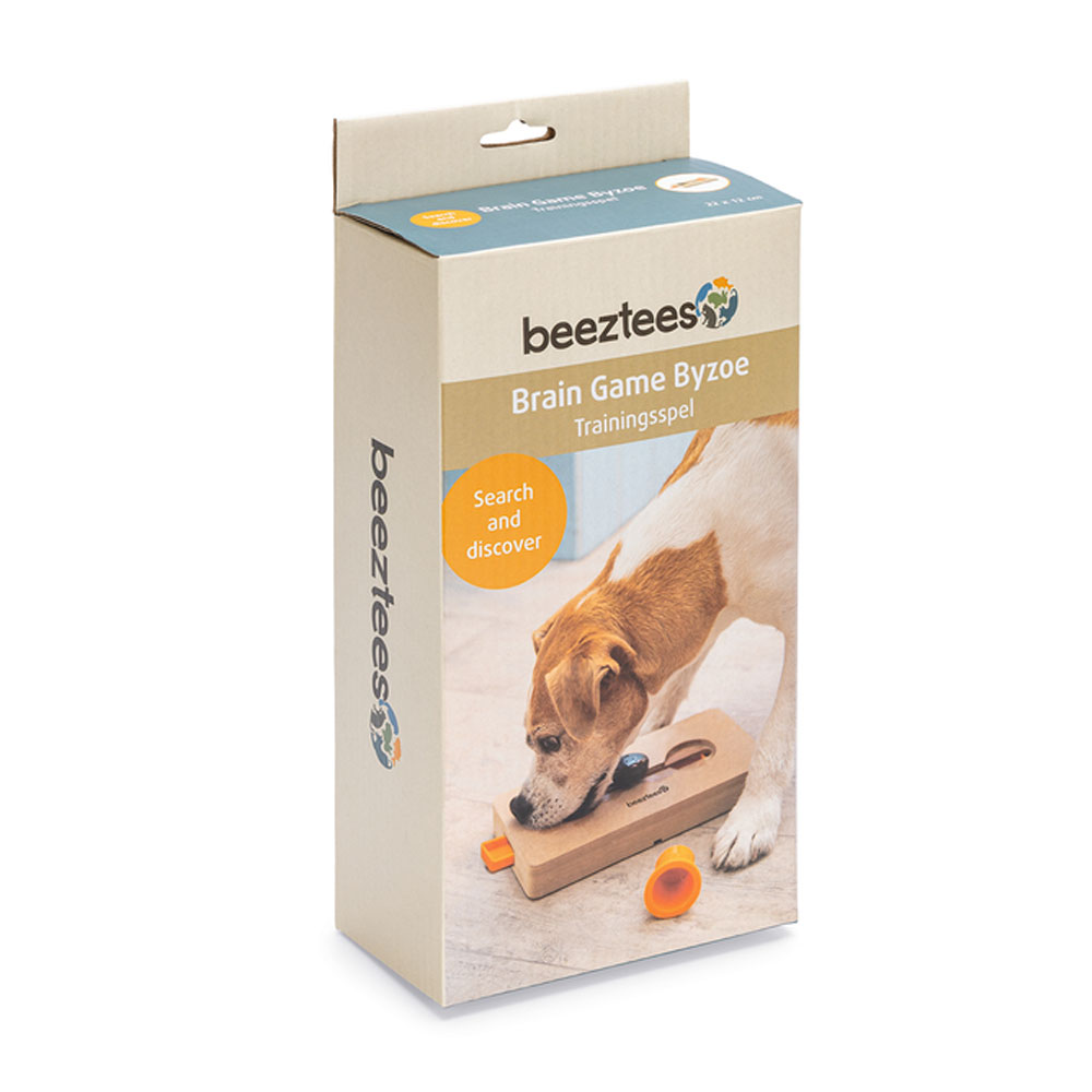 Das Beeztees Braingame Byzoe fordert deinen Hund auf spielerische Weise physisch und mental heraus, da er hier auf der Suche nach den versteckten Snacks verschiedene "Hürden" überwinden muss. Verstecke einen oder mehrere Snacks in dem großen orangefarbenen Schieber. Dein Hund muss nun zunächst den orangefarbenen Schalter bewegen, um die Schieber zu lösen und in beide Richtungen bewegen zu können. Durch den braunen Schalter kann dein Hund nun den orangefarbenen Schieber hin und herbewegen, um an die Belohnung heran zu kommen.