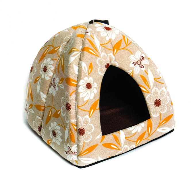 Die Höhle verfügt über ein herausnehmbares Innenkissen. Der sichtbare Stoff ist Baumwolle, Boden und Innenfutter bestehen aus strapazierbarem Polyesterstoff.