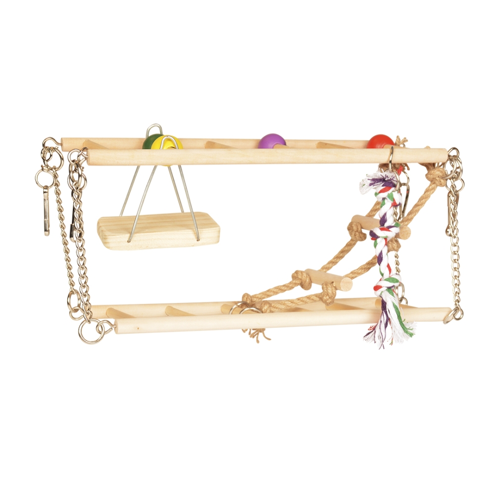 Diese duvoplus Holzhängebrücke für Nagetiere ist ein lustiges Spielzeug zum Klettern und Spielen. Die zwei Holzleitern sind durch eine Seilleiter verbunden, außerdem sind ein Baumwollseil-Spielzeug und eine Holzschaukel inkludiert. Die Brücke beinhaltet ein stabiles Aufhängesystem und kann in jedem Käfig angebracht werden.