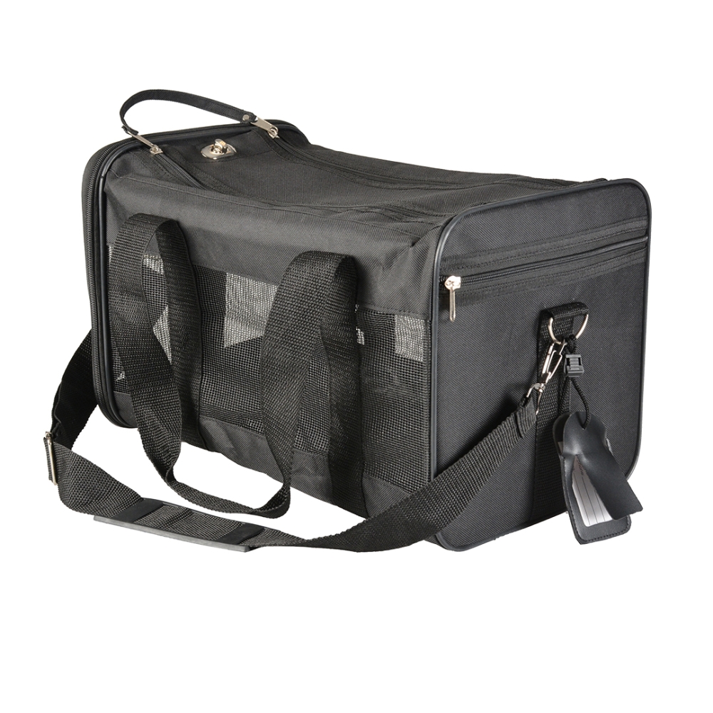 Genießen Sie mit dieser leichten Nylon-Reisetasche von duvoplus einen bequemen Ausflug mit Ihrem Hund oder Ihrer Katze. Die Tasche ist dank der festen Bodenplatte stabil. Die Tragetasche ist mit zwei Reißverschlüssen und oben einem stabilen Griff sowie einem Schultergurt für optimalen Komfort ausgestattet. Die seitlichen Belüftungsöffnungen sorgen für eine gute Luftzirkulation. Die Tasche ist außerdem mit einem Adressetikett ausgestattet und die Seitentasche bietet Platz für Zubehör. Machen Sie sich also sorglos, sicher und bequem auf den Weg