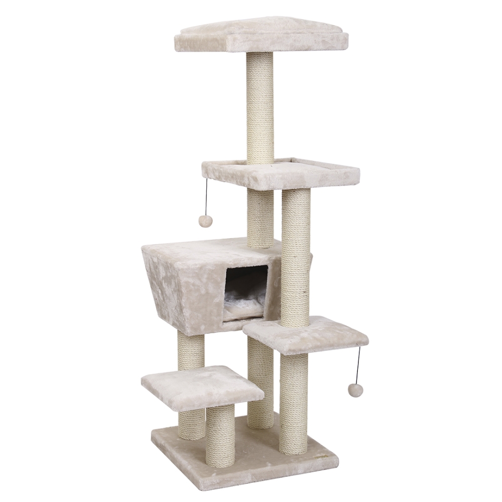 Der Kratzbaum Trend North Dakota ist ein moderner mittelgroßer Kratzbaum mit verschiedenen Liege- und Sitzbereichen sowie einem Ruhe- und Schlafhäuschen. Sehr robust und verschleißfest durch komplett verklebtes Sisal und Plüsch. Im Häuschen und auf der obersten Liegefläche ist ein weiches Kissen (Waschbar bei 30° C). Zusätzlich ist unter 2 Liegeflächen ein Spielball mit Gummiband angebracht, sodass die Katze nach Herzenslust spielen kann.