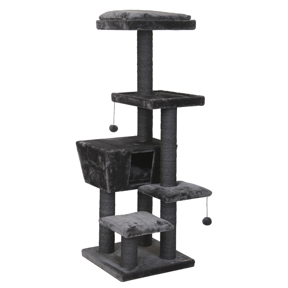 Der Kratzbaum Trend North Dakota ist ein moderner mittelgroßer Kratzbaum mit verschiedenen Liege- und Sitzbereichen sowie einem Ruhe- und Schlafhäuschen. Sehr robust und verschleißfest durch komplett verklebtes Sisal und Plüsch. Im Häuschen und auf der obersten Liegefläche ist ein weiches Kissen (Waschbar bei 30° C). Zusätzlich ist unter 2 Liegeflächen ein Spielball mit Gummiband angebracht, sodass die Katze nach Herzenslust spielen kann.