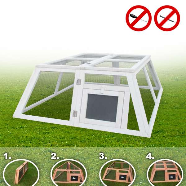 Das Gehege wird durch ein einzigartiges System ohne Schrauben und Nägel ganz einfach aufgeklappt und ist so innerhalb von wenigen Minuten kinderleicht auf- und auch wieder abgebaut.