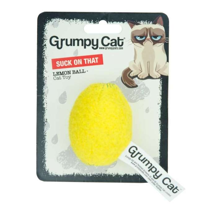 Diese Zitrone kommt aus der Grumpy Cat Linie. Dass Katzen Zitronen komisch finden ist allgemein bekannt, aber jetzt gibt es auch eine als Spielzeug. Diese Grumpy Cat Zitrone ist aus weichem Filz gefertigt in Kombination mit einem Glöckchen und Catnip (Katzenminze).