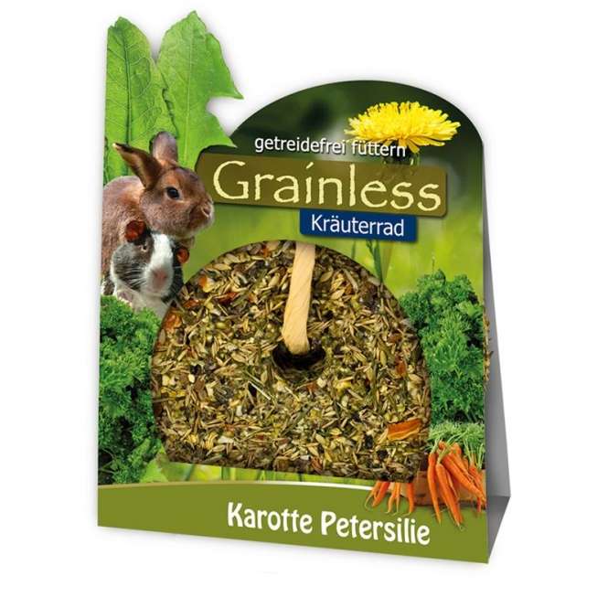 Leckeres Rad zum Aufhängen im Nagerheim. Mit vielen gesunden Kräutern, verfeinert mit Karotten und Petersilie. Perfekte Beschäftigung für alle Nager.