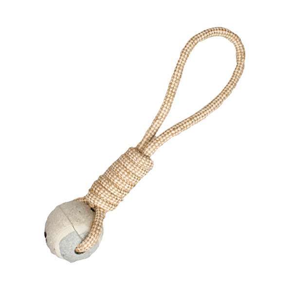 Jute-Ziehspielzeug mit Tennisball für Wurf-, Zerr- und Apportierspiele.