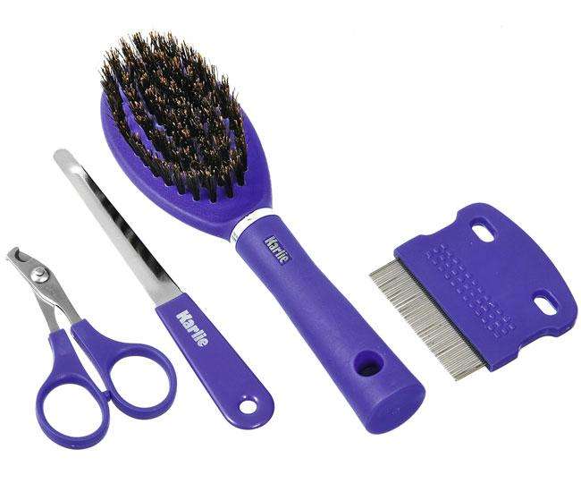 Pflegeset für Katzen aus der Karlie Perfect Care Pflegeserie. Auch geeignet für Katzen mit langem und krausem Fell. Das 4-teilige Pflegeset besteht aus einem Nissenkamm, einer Krallenfeile, eine Krallenschere und einer Katzenbürste mit Borsten.