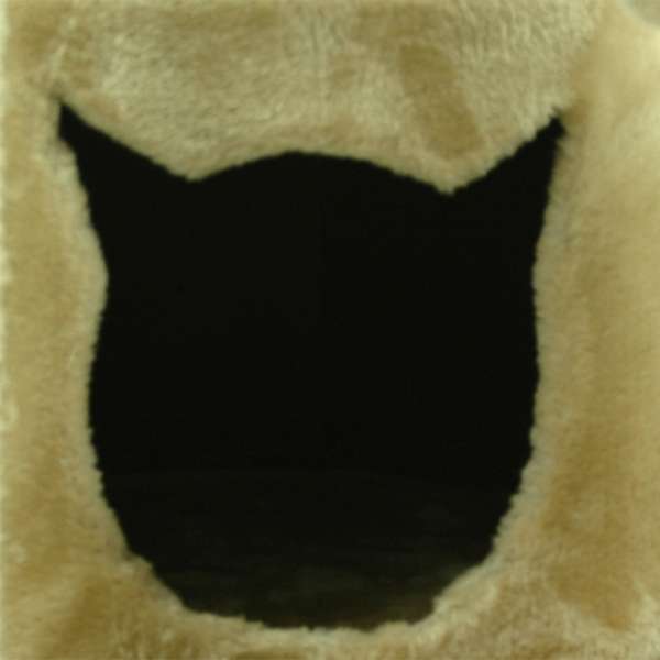 Direkt unter diesem Schlafplatz ist ein Plüschball an einem Gummiband befestigt, der durch seine eingebaute Rassel immer wieder zum Spielen einlädt. Als letztes Element darf selbstverständlich auch eine Höhle als Rückzugsmöglichkeit nicht fehlen. Diese ist beim Tapsi trotz der geringen Kratzbaumgröße wirklich geräumig, wenn man sie mit vielen anderen (auch größeren) Kratzbäumen vergleicht. Die Höhle besitzt einen Durchmesser von ca. 35 cm und eine Höhe von ca. 25 cm. Der Eingang in Form eines Katzenkopfes hat einen Durchmesser von ca. 16 cm. Als weiteres niedliches Detail ist die Oberseite der Höhle noch mit einem Pfotenabdruck verziert, der in der Kontrastfarbe braun das Gesamtbild auflockert.