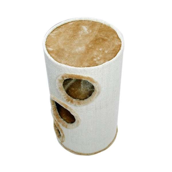 Das Innere der Kratztonne besteht aus drei Etagen, die alle durch Löcher verbunden sind. Der Durchmesser dieser Durchgangslöcher beträgt ca. 14 cm. Die Böden der einzelnen Etagen sind genau wie die Oberseite der Kratztonne mit weichem Plüsch in beige bezogen. So dient auch die Oberseite der Tonne als gemütlicher Schlafplatz für Ihre Samtpfote. Von vorne sind alle drei Etagen durch je ein Eingangsloch mit einem Durchmesser von ca. 17 cm zu erreichen. Alle drei Eingangslöcher sind mit einem Plüschrand versehen.