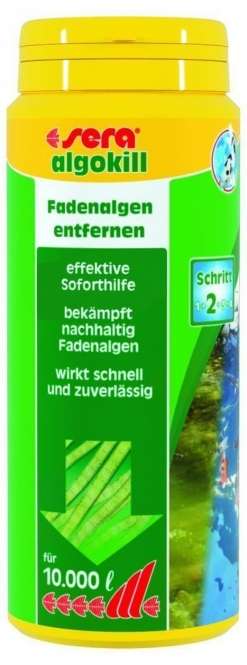 Durch die Freisetzung von aktivem Sauerstoff werden Fadenalgen nachhaltig zerstört. Zudem wird der durch absterbende Algen im Teich entstehende Sauerstoffmangel durch sera pond algokill* ausgeglichen. sera pond algokill* wird direkt auf die Algenmatten aufgestreut. Das Produkt wirkt dann sofort und effektiv am Problemort.