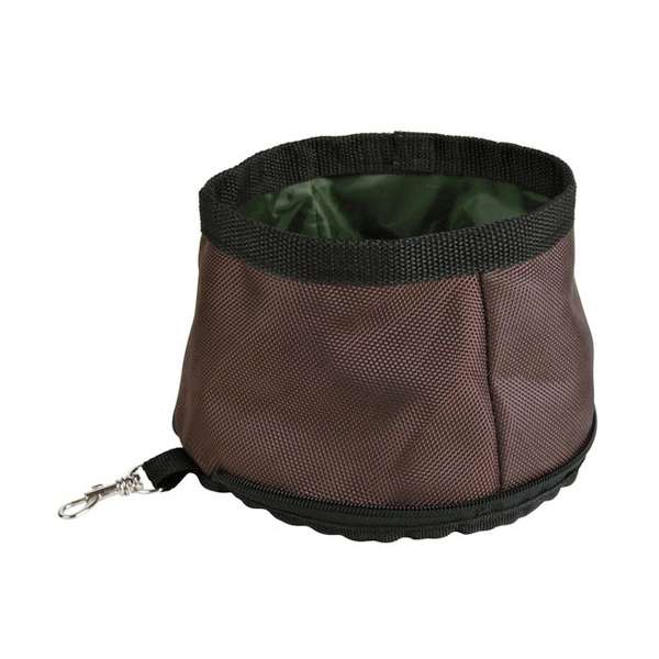 Der Dog on Tour Reisetrinknapf des Qualitätsherstellers Trixie besteht aus besonders strapazierfähigem und hochwertigem Nylonmaterial und ist der ideale Begleiter für Reisen oder lange Spaziergänge. Er fasst bis zu 2,1 Liter Wasser und lässt sich dank eines Reißverschlusses zusammenfalten und platzsparend verstauen. Im zusammengelegten Zustand kann er dann mit Hilfe des montierten Bolzenhakens am Gürtel oder an der Hundeleine befestigt werden. Zur Reinigung kann der Napf einfach ausgewischt werden.