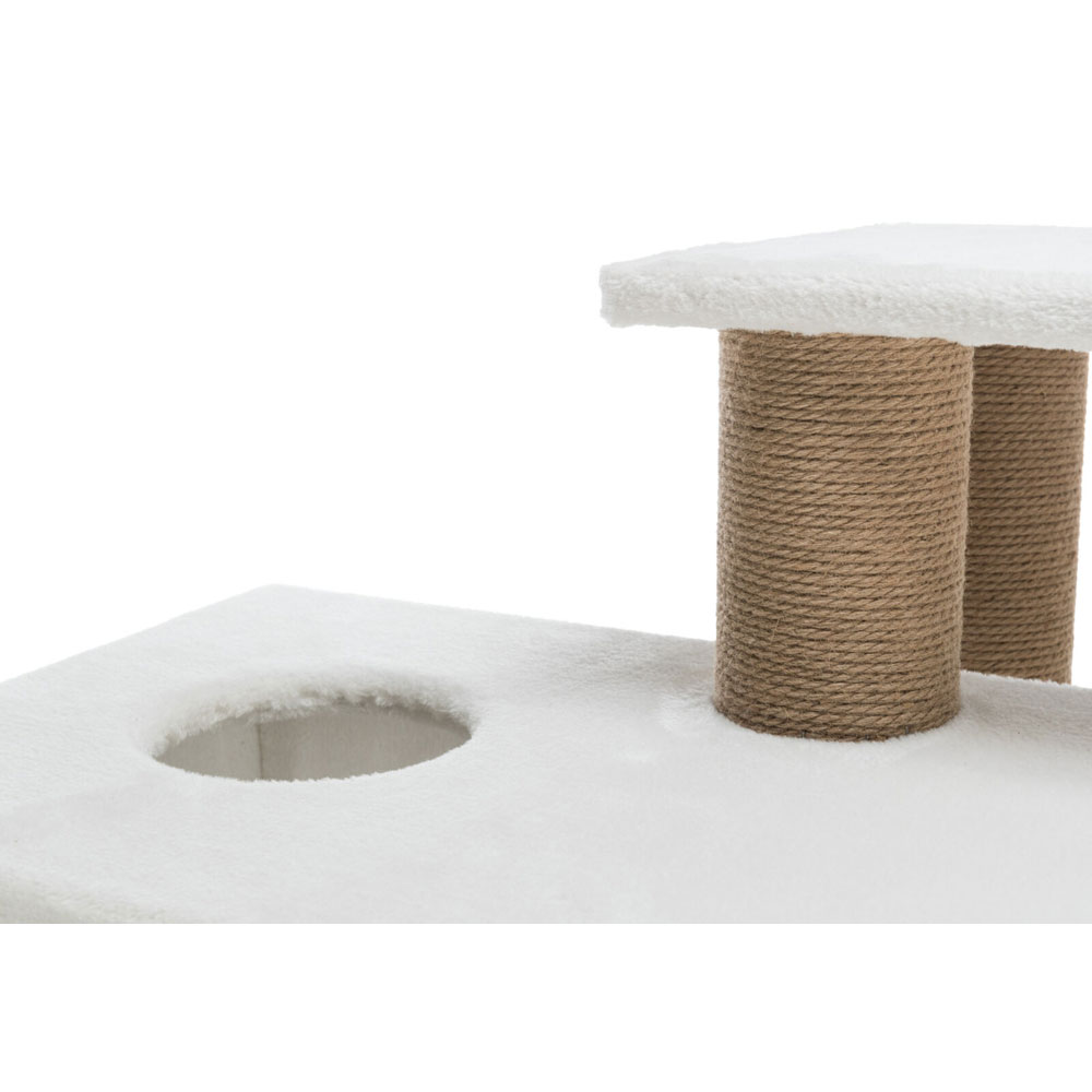 Der als Raumteiler nutzbare Kratzbaum Catarina bietet gleich mehreren Stubentigern genügend Platz zum Ausruhen, Klettern und Spielen. In den mit weichem Plüsch und Fleece bezogenen Höhlen auf unterschiedlichen Ebenen können sich deine Katzen ausruhen, verstecken und durch gleich mehrere Öffnungen Ausschau halten. Die Höhlen sind mit Wendekissen ausgestattet, welche per Handwäsche gereinigt werden können. Auch der stabile Kuschelsack ist bestens zum Ausruhen geeignet. Die mit Jute ausgestatteten Kratzstämme und die zwei Sisalkratzflächen an den Außenseiten bieten deinen Samtpfoten diverse Kratz- und Klettermöglichkeiten, zur zusätzlichen Beschäftigung ist ein Spielball aus Plüsch am Kratzbaum befestigt.