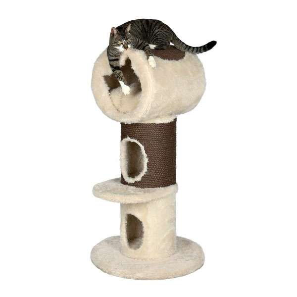 Der Trixie Kratzbaum Nico ist mit beigefarbenem Langhaar-Plüsch bezogen und besteht aus zwei Höhlen. Die untere Höhle besitzt zwei Etagen, wobei die obere Etage mit extra dickem Natursisal umwickelt ist und so eine Möglichkeit zum Krallenschärfen bietet. Die obere Höhle mit Eingang in Form eines Katzenkopfes ist ebenfalls oben mit einer Sisal-Kratzfläche bestückt und beinhaltet außerdem ein Kissen, welches bei 30°C per Handwäsche gereinigt werden kann. Beide Höhlen sind komplett mit Langhaar-Plüsch ausgestattet.