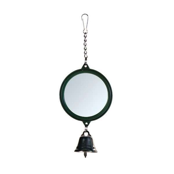 Runder Spiegel mit Kunststoffrahmen und Glöckchen zum Einhängen in Vogelkäfige.