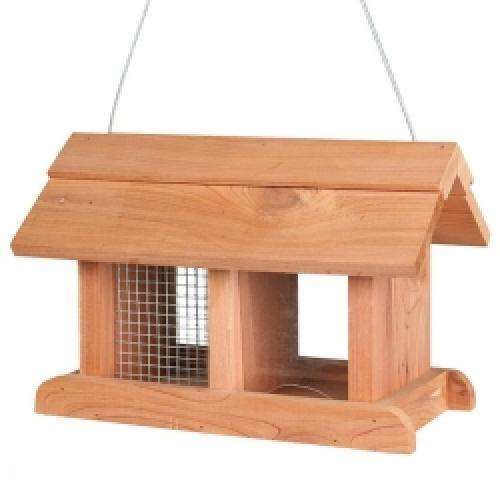 Das Futterhaus besteht aus robustem, dauerhaftem Zedernholz und besitzt eine hohe Resistenz gegen Witterungs- und Schädlingseinflüsse. Der getrennte Aufbau beinhaltet einerseits ein Plexiglas-Silo für Saatfutter und zum anderen eine Gitterbox für grobkörniges Futter, wie z.B. Nüsse. Mithilfe der montierten Schlaufe aus ummanteltem Stahlseil, lässt sich das Haus ganz einfach an beliebiger Stelle aufhängen. Der Dachüberstand sorgt dafür, dass kein Regenwasser das Futter erreichen kann. Als Landefläche dienen Sitzbalken an beiden Seiten, auf denen kleine Vögel ohne Probleme genug Platz finden, um in Ruhe essen zu können. Auch die Befüllung mit Futter geschieht ganz mühelos, indem der mittlere Teile des Spitzdaches einfach nach oben hin abgehoben wird. So kann das Futter einfach von oben hineingeschüttet werden.