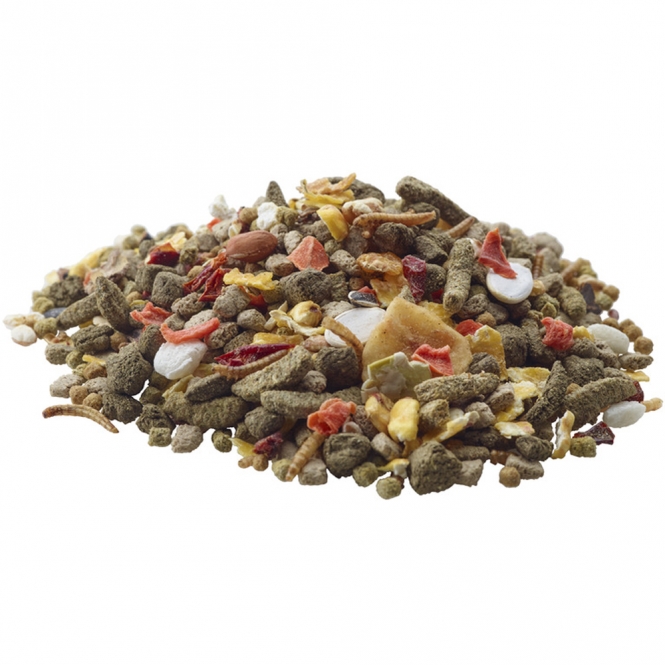 Getreide (Mais 17%), pflanzliche Nebenerzeugnisse, Gemüse (Erbsen 12%, roter Paprika 2%, Karotten 2%), Saaten, Früchte (Banane 1%, Rosinen 1%), pflanzliche Eiweißextrakte, Insekten (Mehlwürmer 4%), Nüsse, Mineralstoffe, Hefen, Kräuter, Öle und Fette, Calendula, FOS, MOS, Traubenkern, Algen, Yucca Analytische Bestandteile