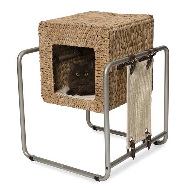 Freunde des Bauhauses und puristisch eleganter Formen werden ihre Freude an dem V-CUBE haben: Der dreidimensional gebogene Stahlrohrrahmen dient als Aufhängung für die große Kubus-Höhle. Die Kratzmatte wird ebenso wie der Kubus über Riemen an der Rahmenseite befestigt.