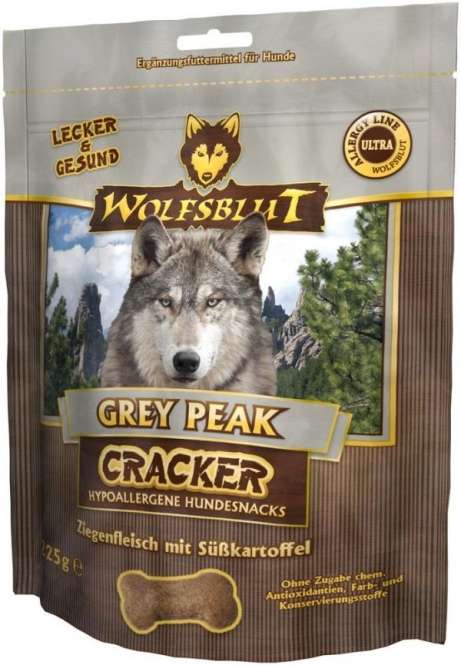 GREY PEAK CRACKER sind komplett getreidefreie Hundekekse mit einem hohen Fleischanteil. Sie bauen auf der Wolfsblut-Futtersorte GREY PEAK auf und enthalten kein Zucker, keine Farb-, Duft-, Füll-, Lock- oder Konservierungsstoffe und auch keine chemischen Antioxidantien.